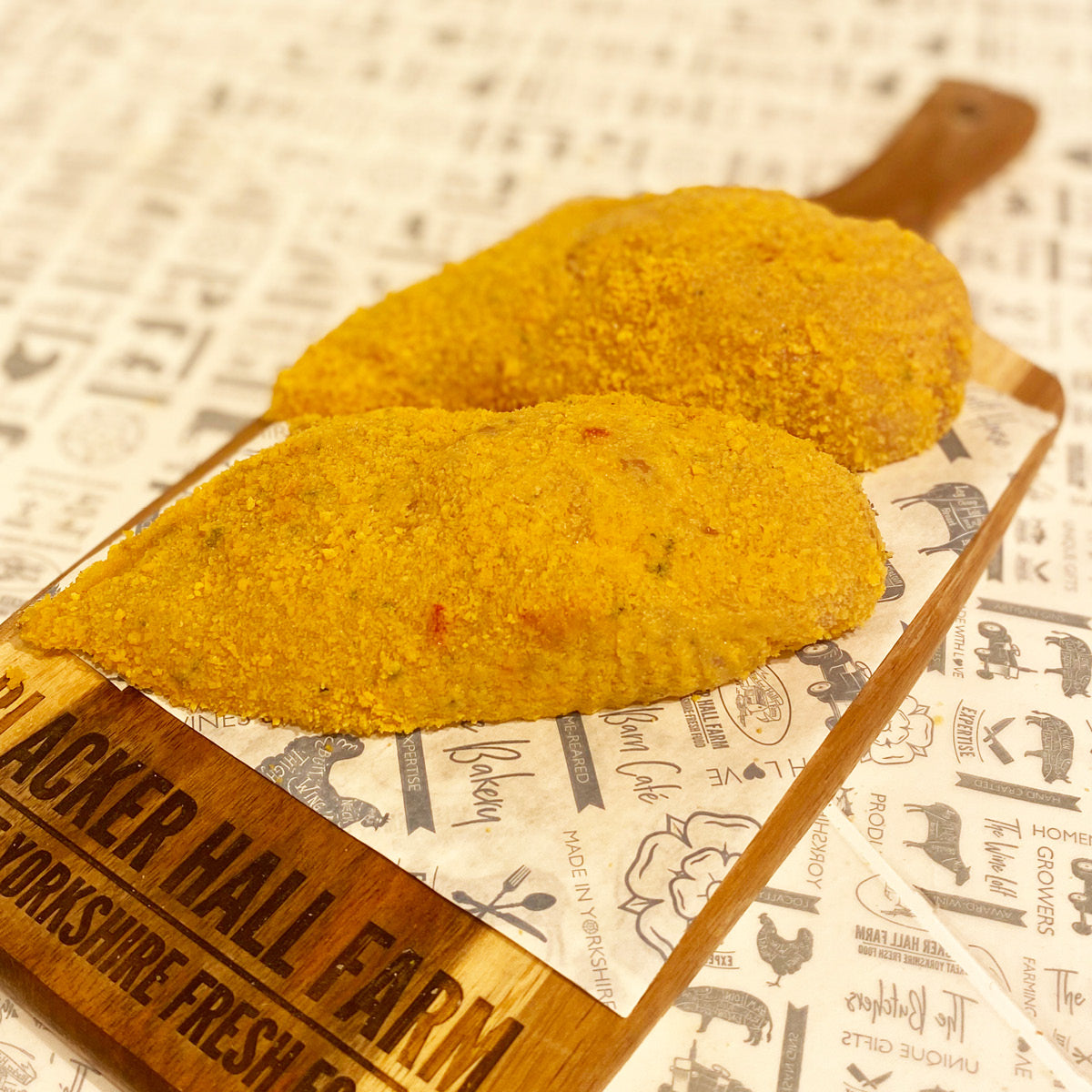 Two locally reared succulent chicken fillets filled with a garlic butter, then breaded and ready to bake..